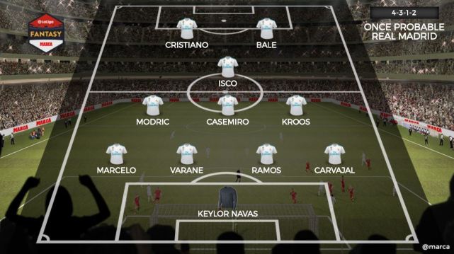 Följande bild visar en möjlig starter för Real Madrid i matchen mot Athletic Bilbao. På frontlinjen kommer Ronaldo att klara sig med Bale. På mittfältet kommer fyra spelare att vara Isco, Luka Modric, Casemiro och Toni Kroos. De fyra försvararna kommer att vara Marcelo, Varane, Sergio Ramos och Carvajal. Målvakten blir Navas. Denna start är i grunden den starkaste starteren som Real Madrid kan ladda ut.